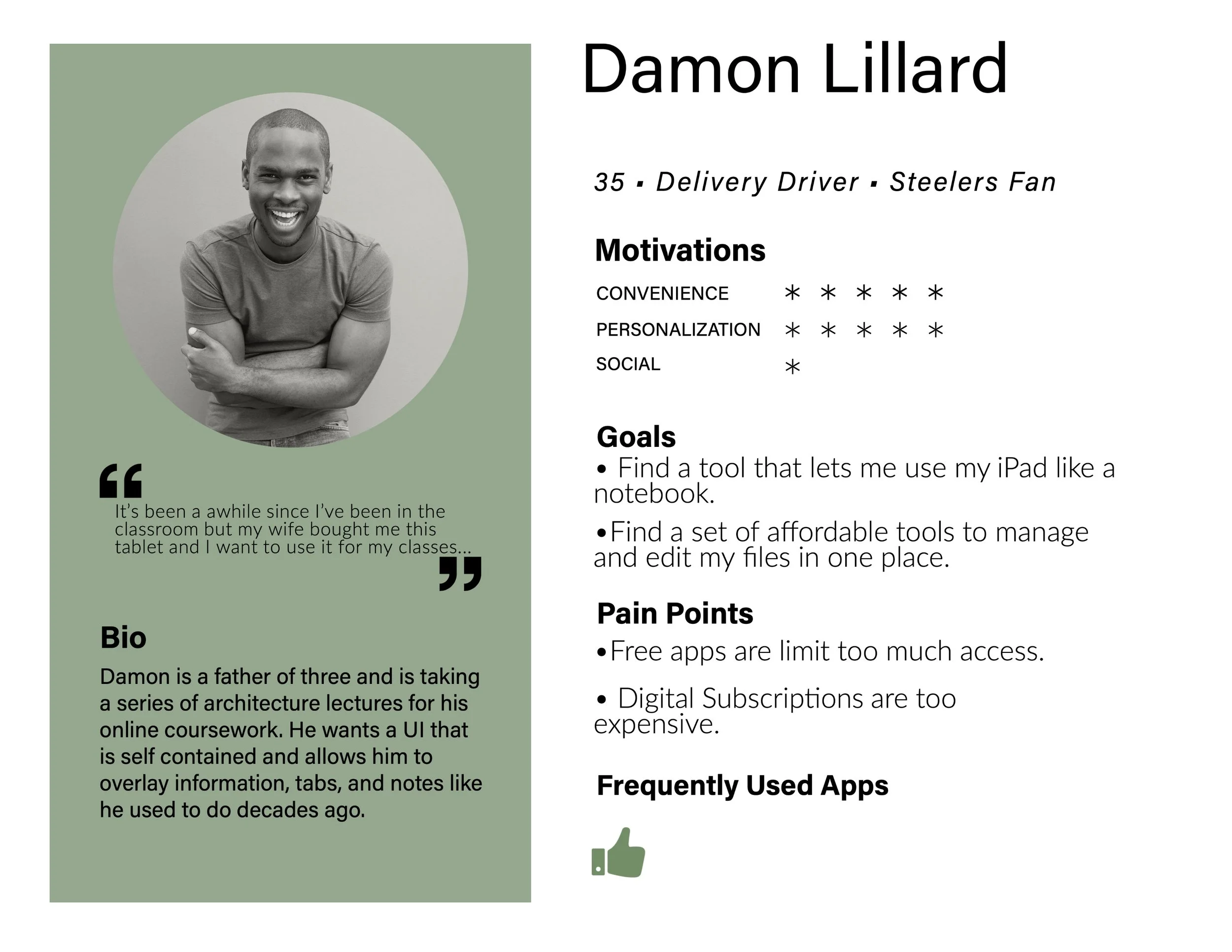 I conducted user interview and developed empathy maps to identify my user ( architecture students) and their needs. I discovered that several users struggled to organize digital documentation of lectures with hand drawn sketches or notes. Consolidating the different capture techniques involved too many different types of software to merge documents and wasted precious time taking away their focus on production in design studio.